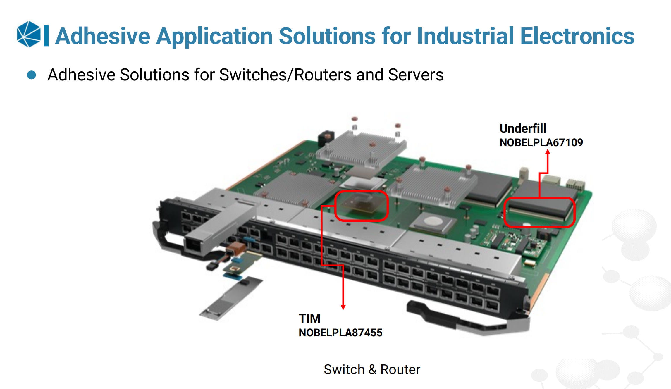 | Thermal for Mainboard Chips | Al + EMC | NOBELPLA 85189, NOBELPLA 87455 |