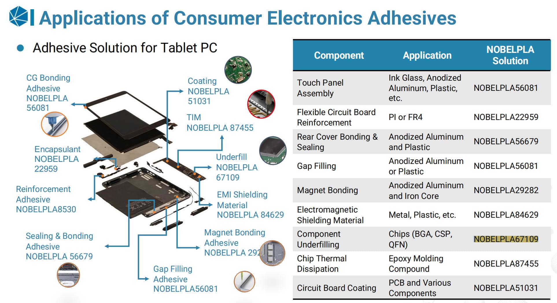The material exhibits high hardness (Shore D 87) and lap shear strength (16 MPa), offering excellent mechanical stress resistance and protection for solder joints during thermal cycling and warm stamping. Additionally, NOBELPLA67109 is reworkable, enabling maintenance or repair of assemblies. Customizable formulations allow optimization for substrate compatibility and enhanced underfill performance, ensuring reliable operation of advanced electronic devices.