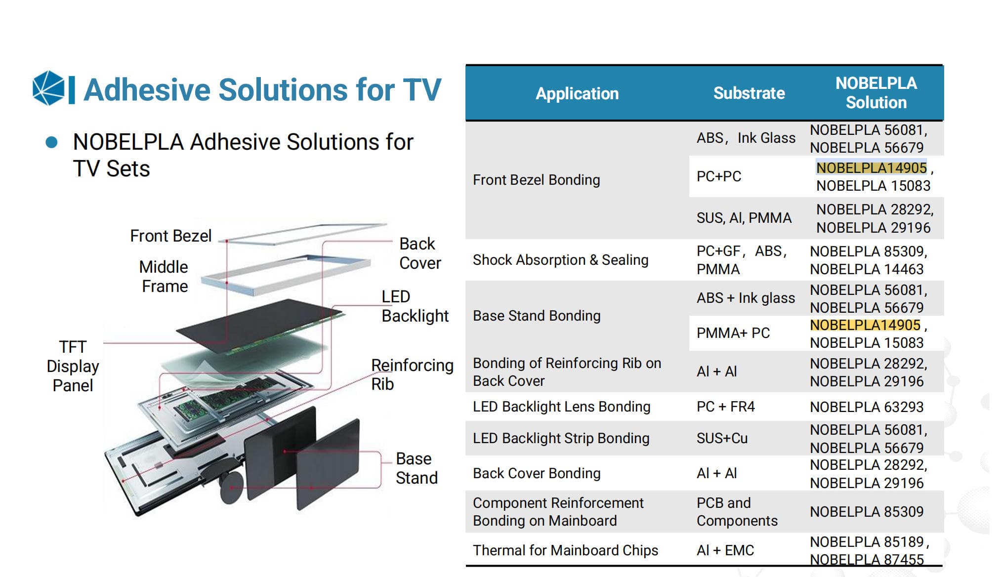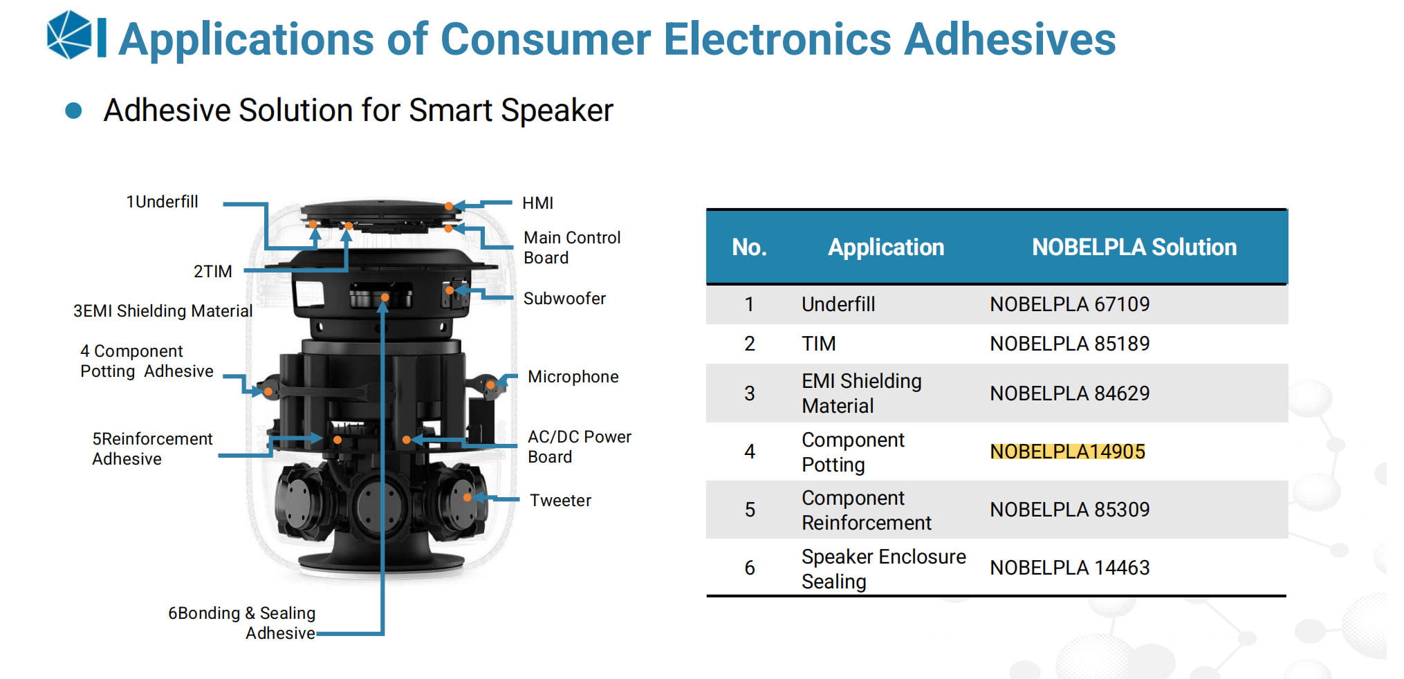 | Application | Adhesive Solution of Consumer Electronics Adhesives such as Smart Speaker |
