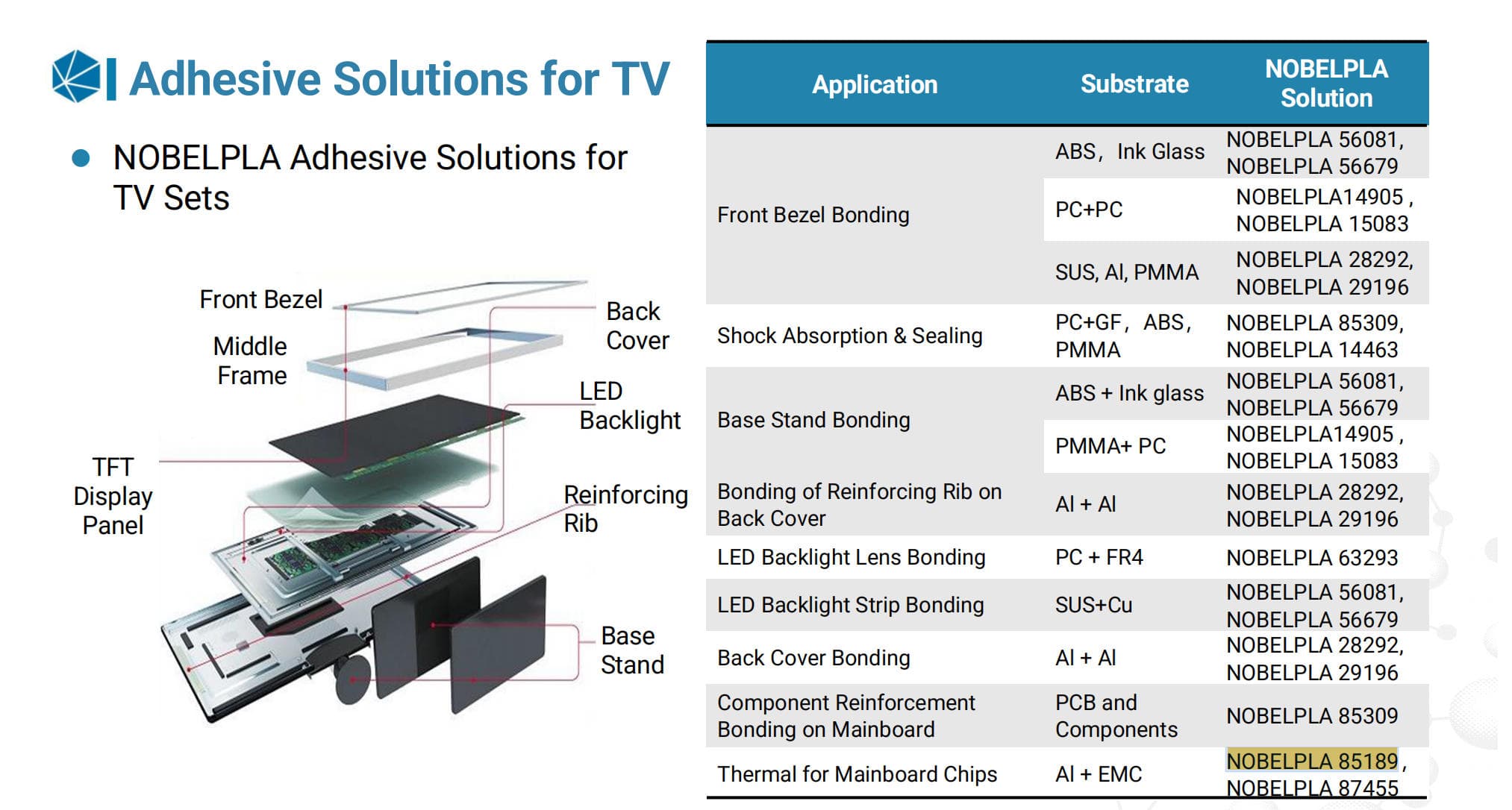 NOBELPLA85189 is a high-performance, one-component silicone-based thermal grease designed for efficient heat dissipation in TV mainboard chips and Al + EMC assemblies. The material provides high thermal conductivity (3.0 W/m·K) while maintaining a low modulus to reduce mechanical stress on delicate components.