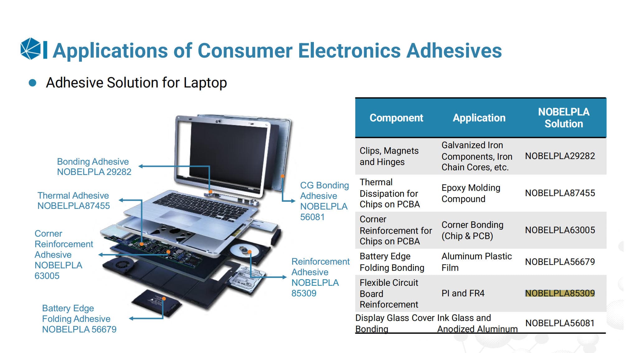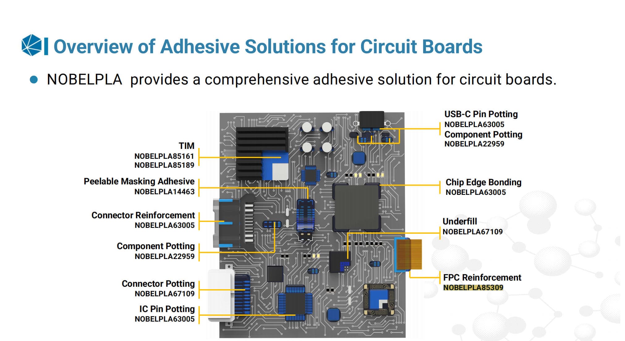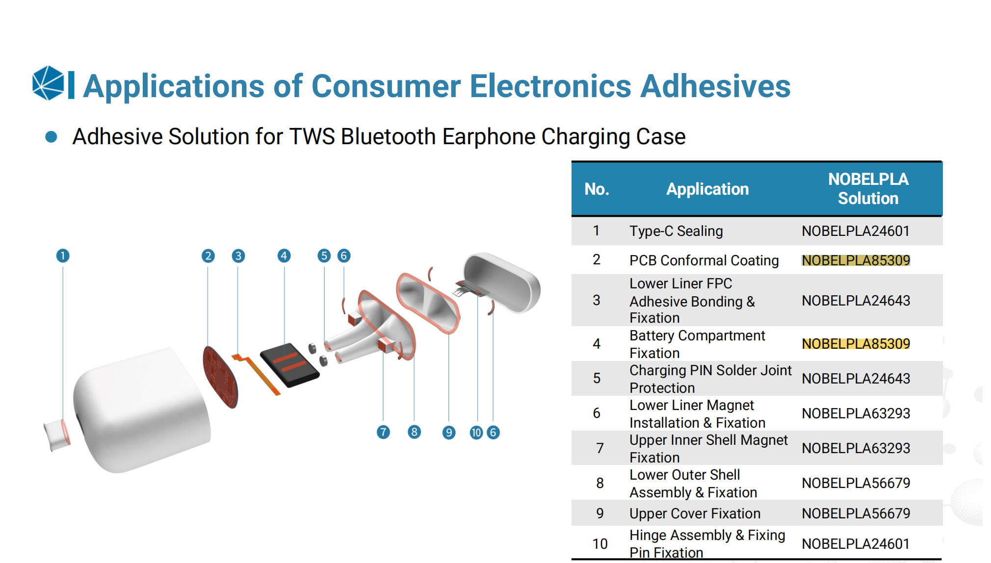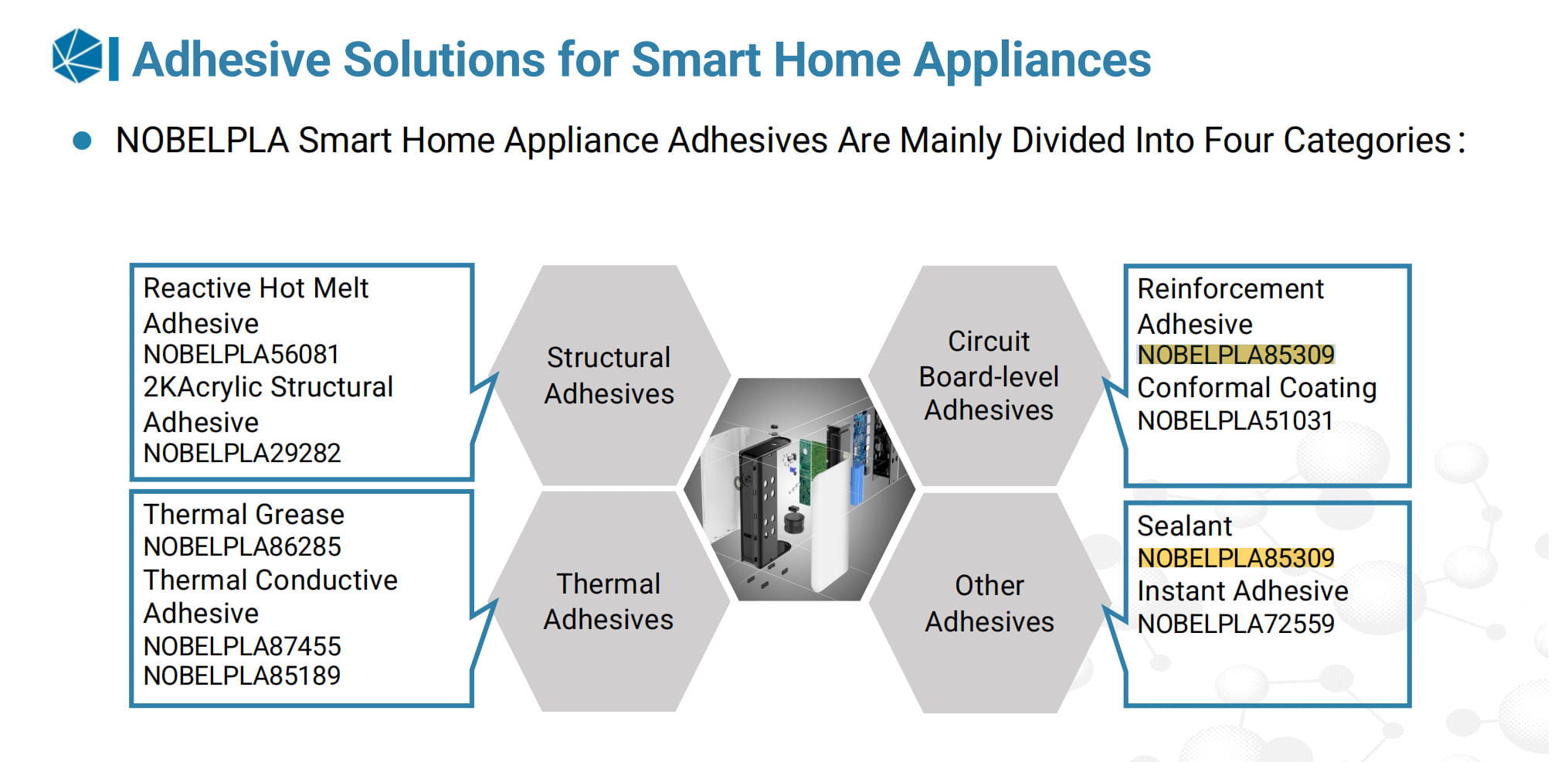 The dual curing capability—room temperature curing or rapid heat curing—offers enhanced manufacturing flexibility and process efficiency. Additionally, customizable formulations allow optimization for specific design and performance requirements, making NOBELPLA85309 an ideal solution for sealing and encapsulation applications in smart home and consumer electronic devices.